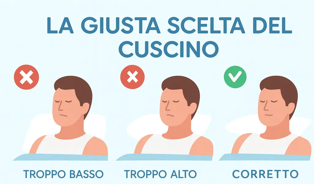 L’altezza del cuscino deve mantenere la testa allineata con la colonna vertebrale. Un cuscino troppo alto o basso crea tensioni muscolari. Lo spessore ideale varia in base alla posizione durante il sonno.